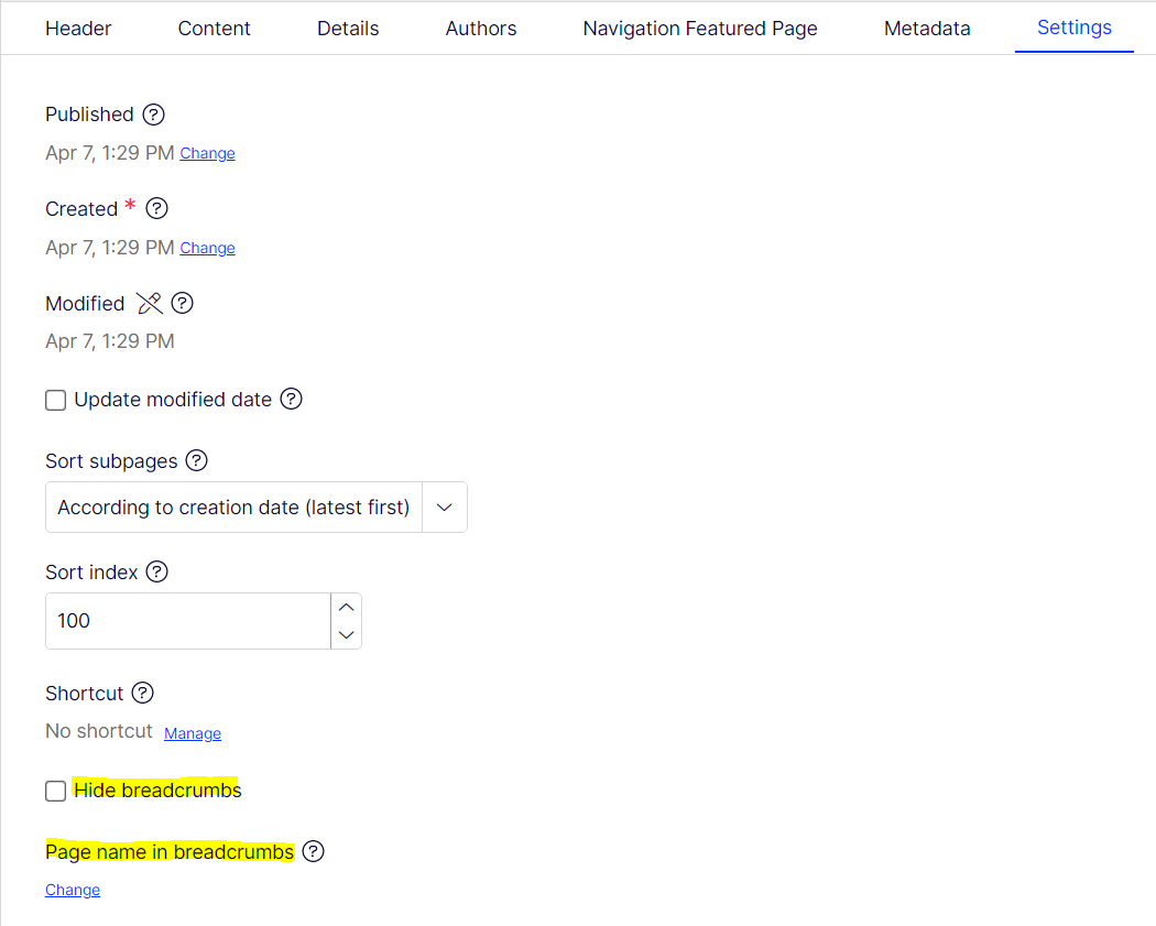 2. Page name in breadcrumbs - this can be used to set the name that should be displayed for the page inside the breadcrumbs.